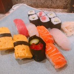 梅寿司 - 私は甲殻類と軟体類アレルギーあり、ホタテとエビとイカのネタを卵とサーモンとカンパチに変えていただきました。